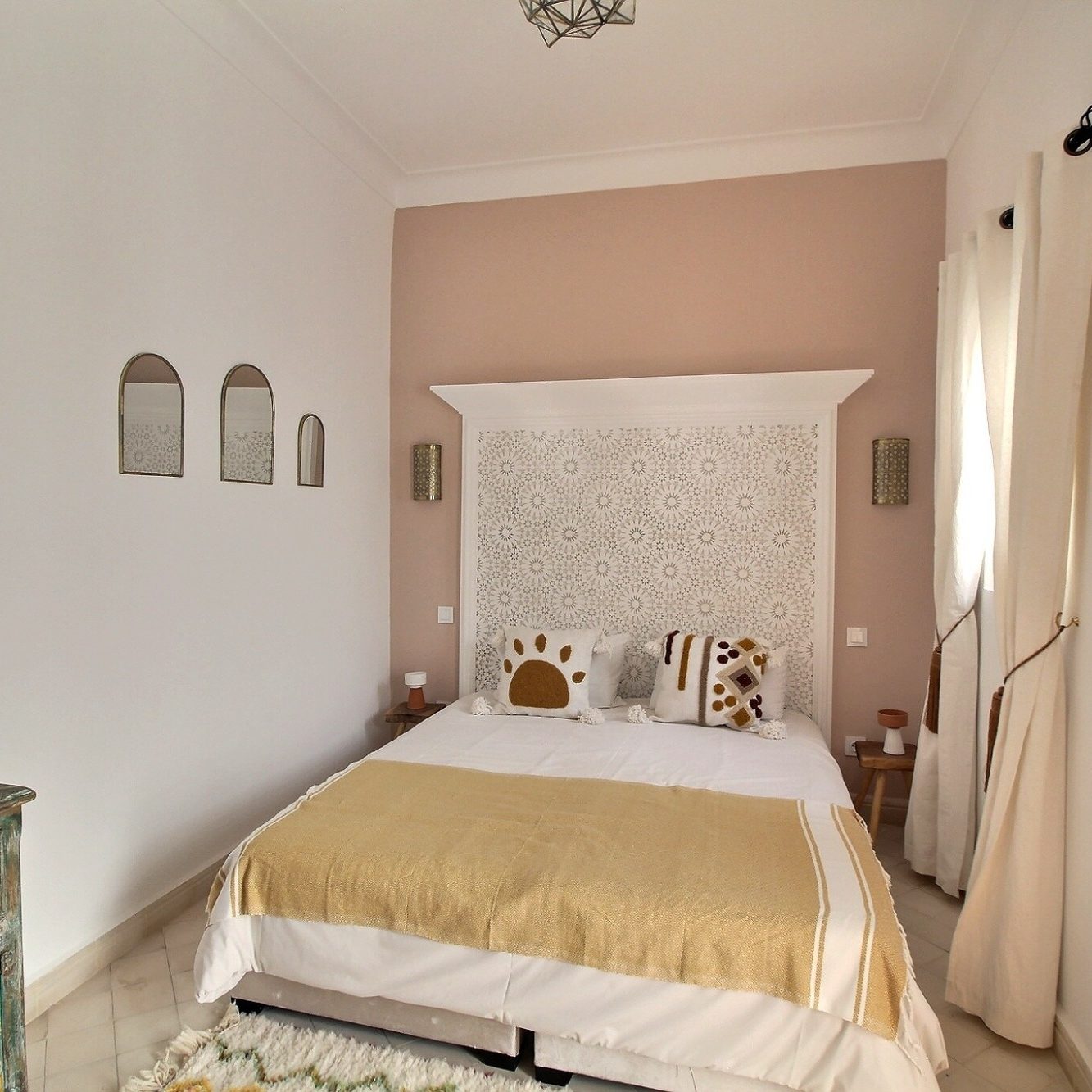 Tissus raffinés, artisanat local et literie de qualité créent une atmosphère chaleureuse et élégante.